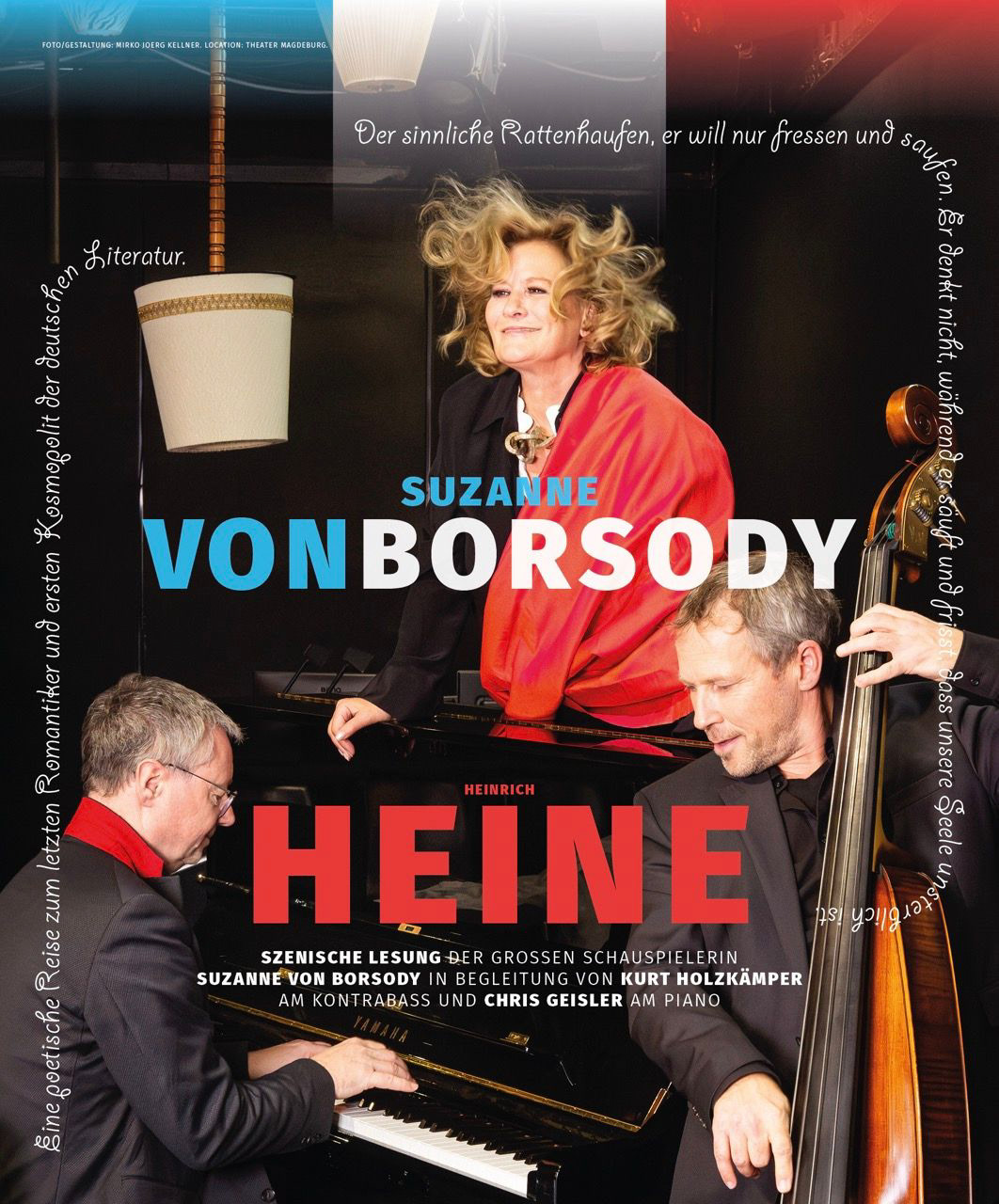 Die große Schauspielerin Suzanne von Borsody thematisiert Heinrich Heine und entführt bei dieser szenischen Lesung mit ihrer unverwechselbaren Stimme in eine Welt voller Poesie, Jazz und Sinnlichkeit. Musikalisch begleitet wird sie von Kurt Holzkämper am Kontrabass und Chris Geisler am Piano. Live im Forte Belvedere Leisnig.