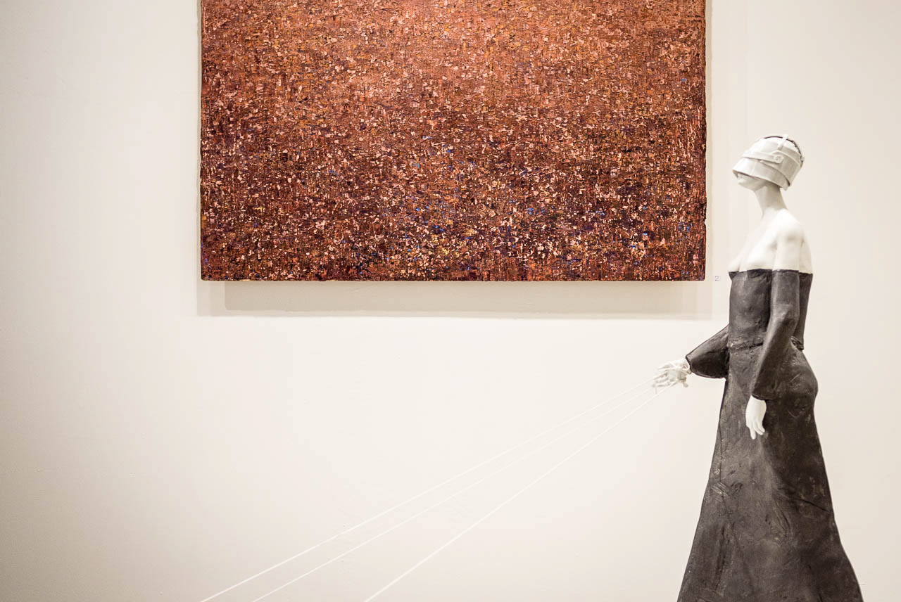 Beispielhafte Kunstwerke in der Galerie Vito von Gaudlitz: Gemälde "CDF's Elbarm" von Michael Freudenberg (Ausschnitt) und die Porzellan-Installation von Olaf Stoy mit dem Titel "Die Zähmung der Steine" (Ausschnitt). Foto: © Mirko Joerg Kellner